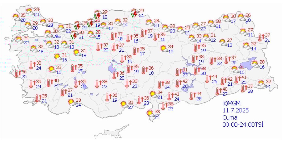 Rüzgarın ise genellikle kuzey yönlerden hafif, ara sıra orta kuvvette, Doğu Anadolu'nun güneydoğusunda kuvvetli (40-60 km/saat) olarak esmesi bekleniyor. Rapora göre; bazı illerde sıcaklıkların 44 dereceye kadar ulaşması bekleniyor.