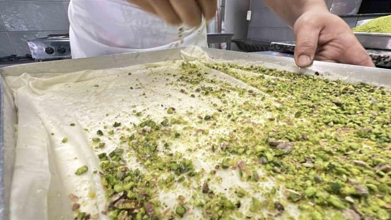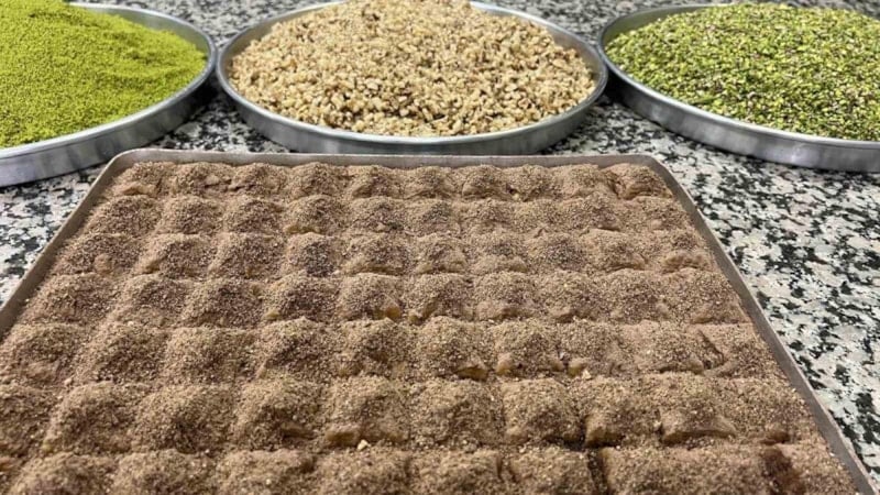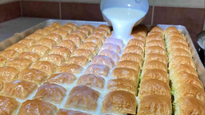 Tatlı ustaları tarafından ince ince açılan hamurun içerisine fıstık, ceviz ve sütün karışımı ile hazırlanan soğuk baklava, tereyağı sürülen tepsilerde odun ateşinde pişiriliyor.