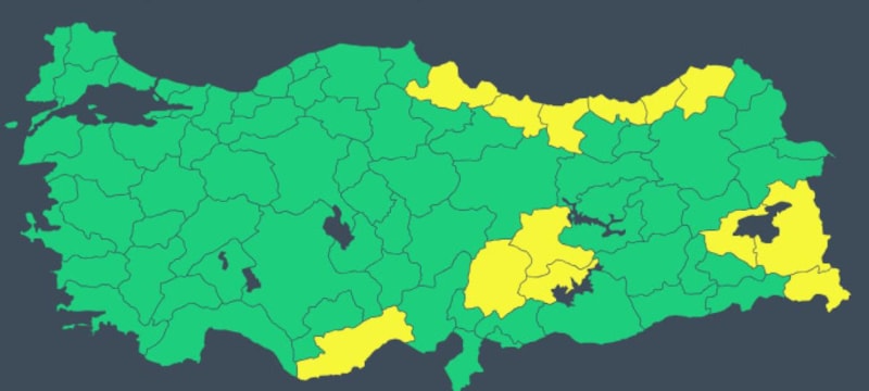 Meteoroloji tarafından, 13 il için sarı kodlu uyarı yapıldı. Uyarı yapılan iller arasında; Adıyaman, Artvin, Bitlis, Giresun, Hakkari, Mersin, Malatya, K.Maraş, Ordu, Rize, Samsun, Trabzon, Van yer aldı.