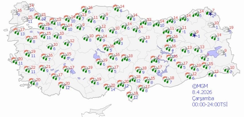 Çarşamba günü sıcaklıkların genel olarak 1-3 derece düşüş göstermesi bekleniyor.