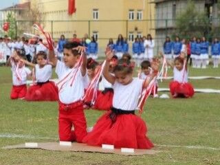 Programda Şehit Üsteğmen Ahmet Konuksever Ortaokulu öğrencileri de çalan müzikler eşliğinde halay çekti. Müziğe kendilerini kaptıran bando takımındaki kız öğrenciler de davul, borazanlarını yere bırakarak halaya katıldı. Renkli görüntülerin ortaya çıktığı stadyumunun ortasına ay yıldız şeklinde branda açıldı. Ay ve yıldız etrafında toplanan öğrenciler balon uçurdu.