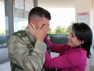 Minibüsle oğlu Barış Keser’in askerlik yaptığı Suriye sınırının sıfır noktasındaki Tekçe Hudut Karakolu’na götürülen anne, kulede nöbet tutan asker oğluna büyük bir sürpriz yaptı. Karakola minibüsle getirilen anne, karakolun içinden gizlice geçerek oğlunun nöbet tuttuğu kuleye doğru gitti. Oğlunu göreceği için çok heyecanlı olduğunu söyleyen anne nöbet yerine giderken Tabur Komutanı Yarbay Gürkan Işıl ise, kuleye çıkarak askerden tekmil aldı. Komutan tekmil aldığı sırada merdivenlerden çıkan anne, Yarbay Gürkan Işıl’ın arkasında durdu. Tekmili bitiren Barış Keser’in yanına giden tabur komutanı, annesini arayıp aramadığını sordu. Barış Keser’in ’daha arayamadım’ demesi üzerine komutanı sol tarafına bakmasını istedi.
