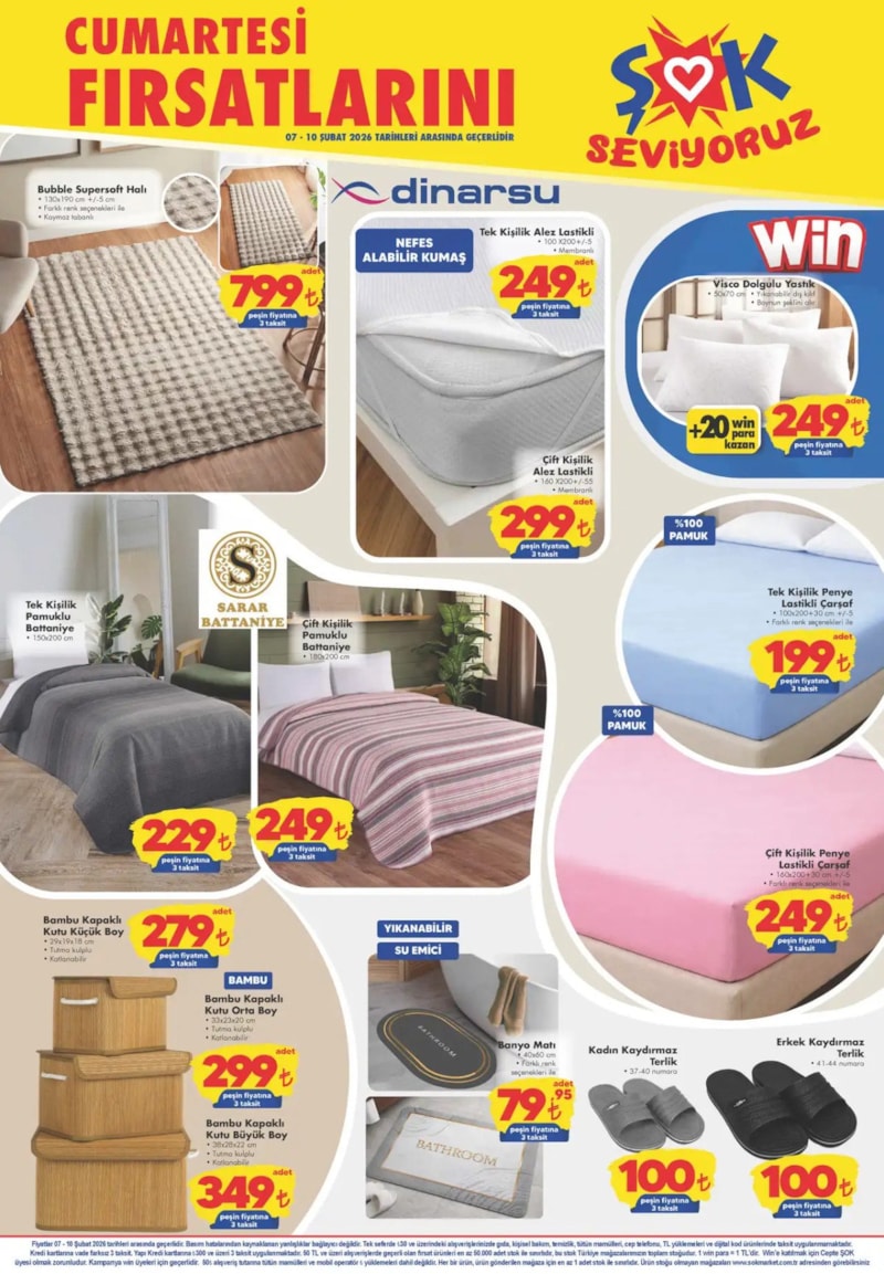 Katalogda yatak alezleri, pamuklu çarşaflar, battaniyeler ve banyo tekstil ürünleri uygun fiyatlarla satışa sunuluyor. Kaydırmaz terlik, banyo paspası ve bambu kapaklı saklama kutuları gibi pratik ürünler de indirimli ürünler arasında yer alıyor. Bazı ürünlerde ise “peşin fiyatına taksit” imkanı sağlanıyor.