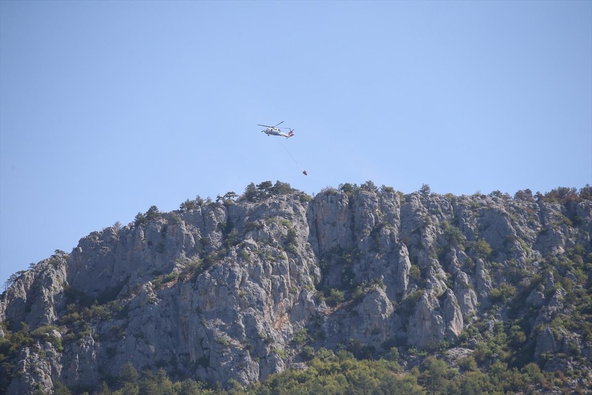 Yangına yakın bölgede bulunan ırmaktan su alan helikopterler, söndürme çalışmalarına devam ediyor.
