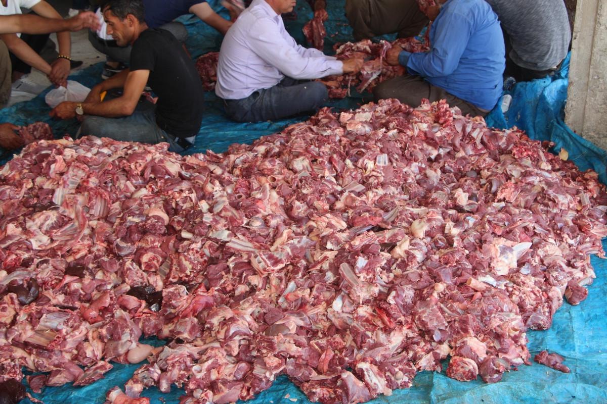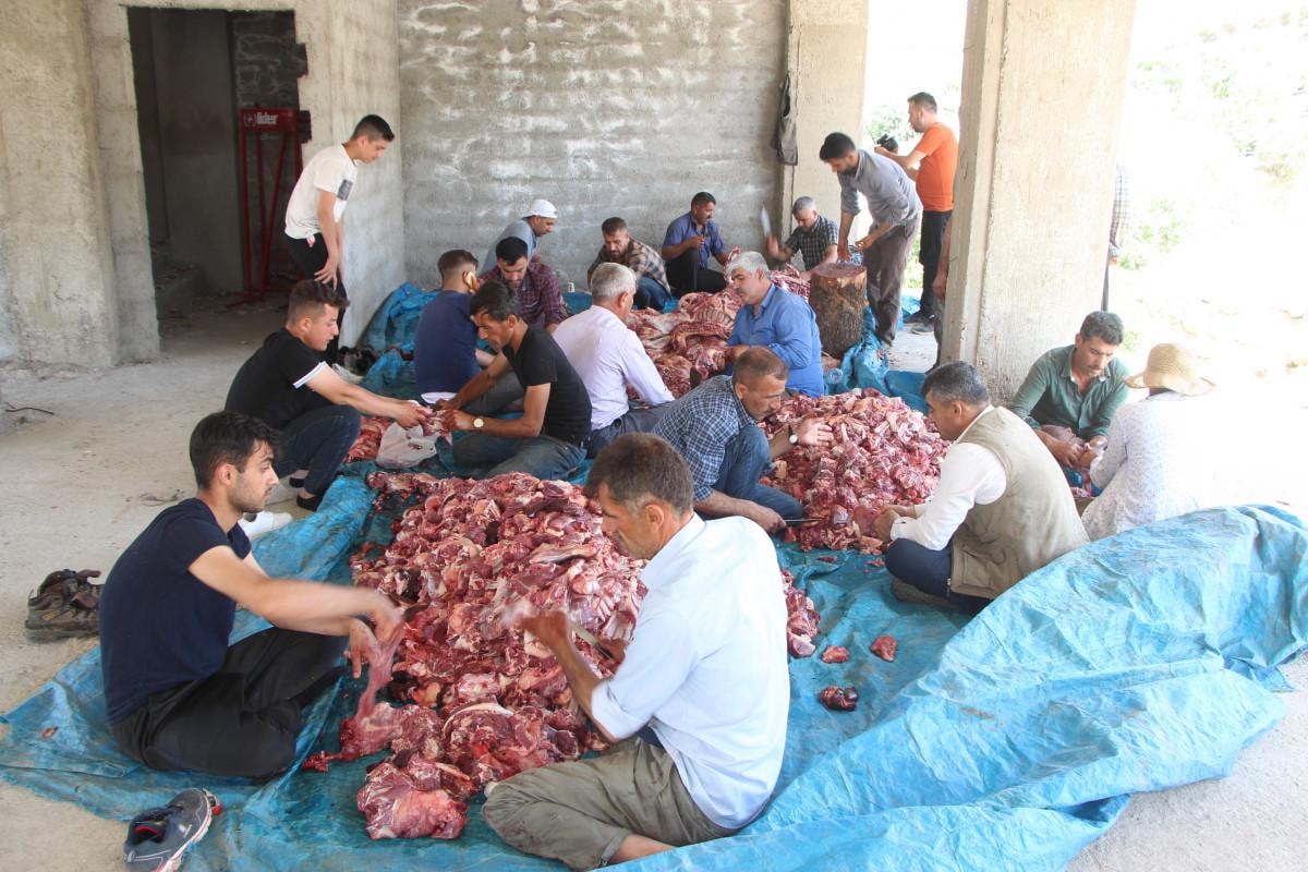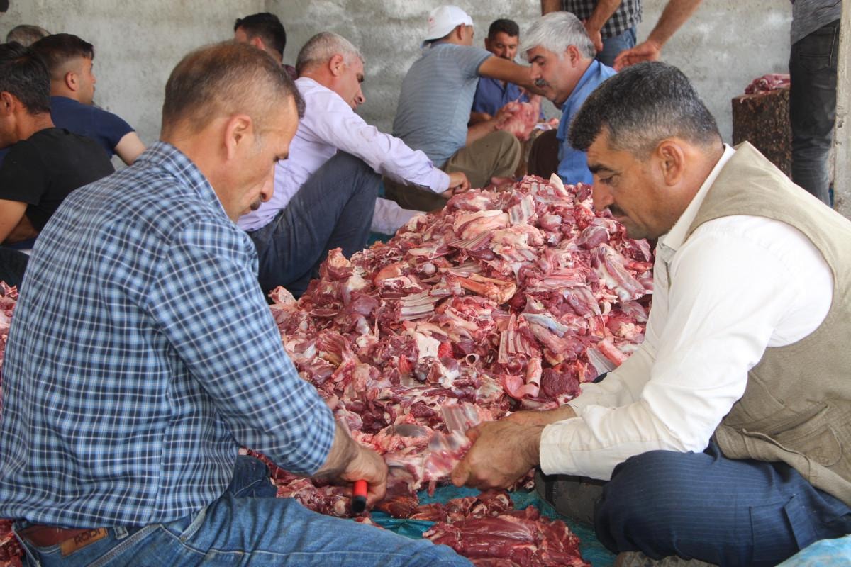 Kesilen kurbanlıklardan elde edilen 1,5 ton et, gönüllüler tarafından parçalanıp eşit paylar halinde köydeki 250 haneye dağıtıldı.
