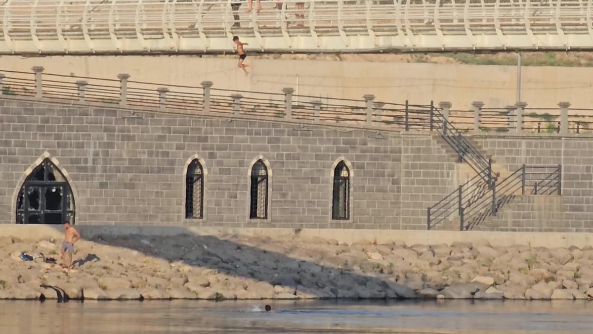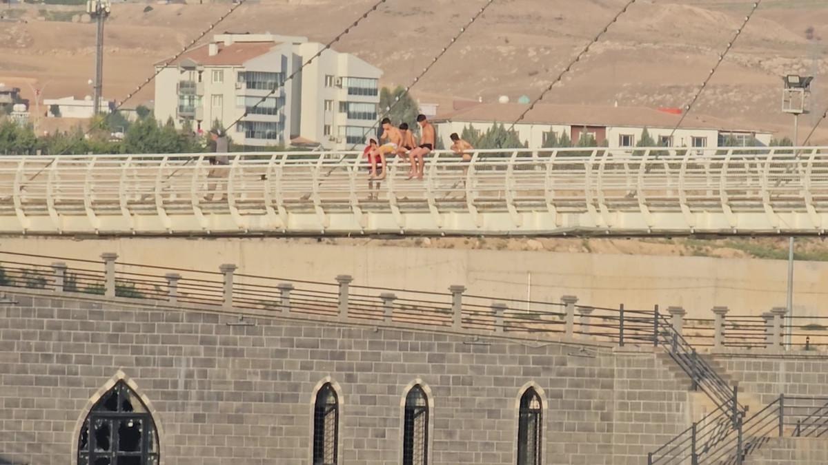 Şırnak'ta, hava sıcaklığının yüksek olduğu Cizre ilçesinde çocuklar, serinlemek için tehlikeye aldırış etmeden İsmail Ebul-iz Elcezeri asma köprüsü üzerine çıkarak Dicle Nehri'ne atladı.