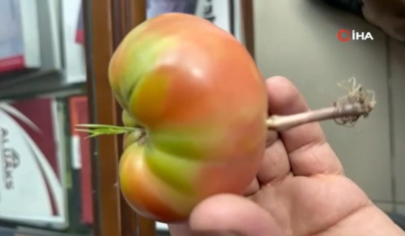 Yıllardır Şeyhmus’la birlikte bahçe işleriyle uğraşıyoruz. Böyle bir olayı ilk kez yaşıyoruz. Domatesin içinden resmen yeşermiş bir ot çıktı. Gözlerimize inanamadık