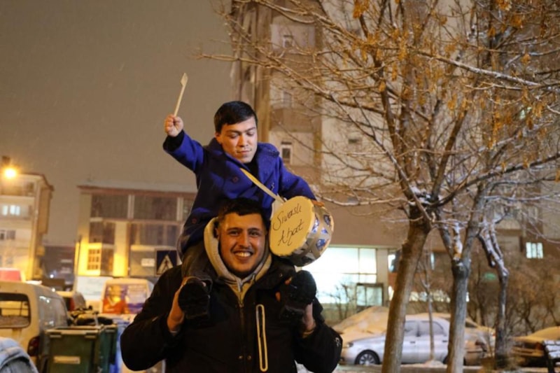 Kentin sevilen siması 108 santimetre boyundaki Ramazan davulcusu, arkadaşının omzuna çıkarak çeşitli maniler söyleyerek küçük davuluyla vatandaşları sahura kaldırıyor.
