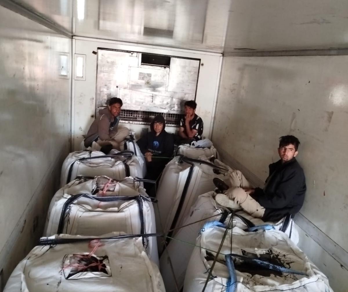 Polis ekipleri tarafından tırların dorse bölümünde yapılan aramada soğuk asfalt çuvallarının arasına gizlenmiş Afganistan uyruklu 7 düzensiz göçmen yakalandı.
