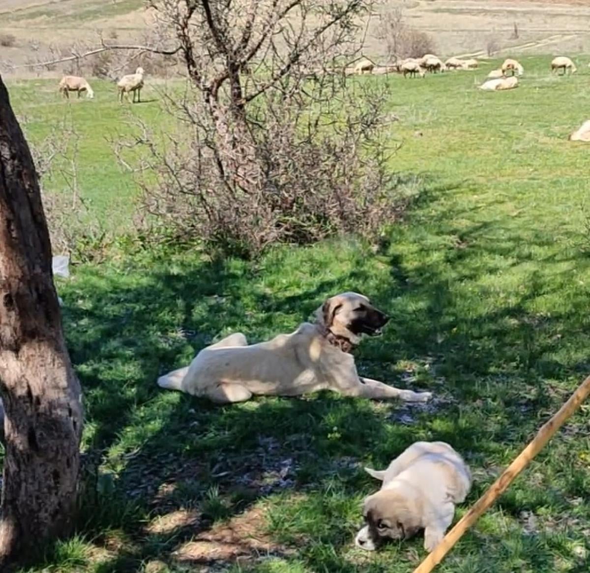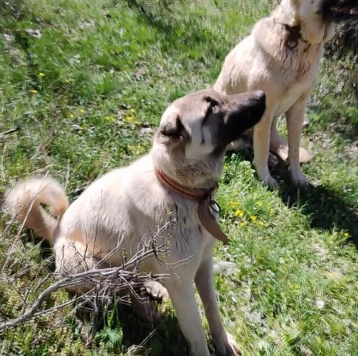 Sivas'ın Hafik ilçesine bağlı Topçuyeni köyü kırsalında sürü otlatan bir çobanın Kangal köpekleri, arazide bir vaşak gördüklerinde aniden hareketlendi.