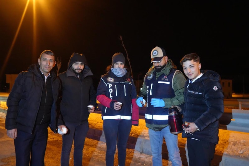 Dondurucu soğuğa, zorlu hava şartlarına rağmen görevlerinin başında olduklarını bildiren Yol Uygulama Kontrol Amiri Komiser Yusuf Akçaoğlu, "Özellikle bölgemizde hava şartları çok çetin geçiyor. Eksi 20, eksi 25 dereceleri görüyoruz. Bu şartlara rağmen görevimizin her daim başında olarak vatandaşların yanında olduğumuzu belirtmek isteriz. Vatandaşlarımıza yönelik yapmış olduğumuz bu yol kontrollerinde çay ikramlarında bulunarak, vatandaşların bir nebze de olsa içini ısıtırken, devletimizin şefkatli yüzünü gösterdik" dedi.