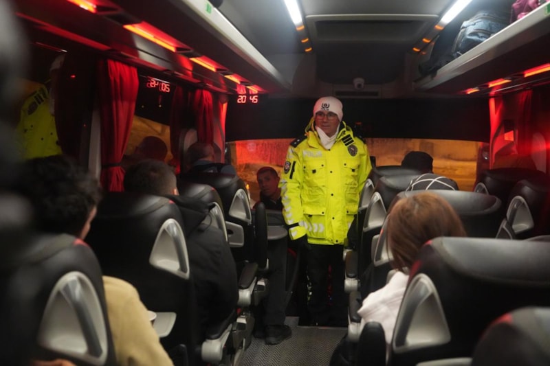 Van'dan Bayburt istikametine gelen bir yolcu otobüsü, denetimler kapsamında uygulama noktasında durduruldu. Ekiplerce, yolculara emniyet kemerinin önemi hatırlatılarak, gerekli uyarılar yapıldı.