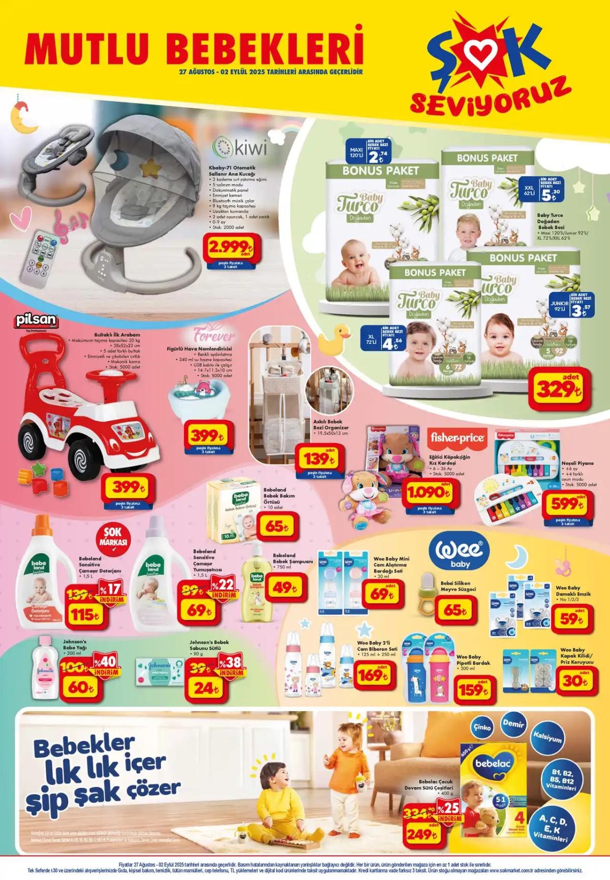 Bebek bakım ürünlerinde otomatik sallanır ana kucağı, bebek bezleri, biberon çeşitleri, bebek şampuanı ve bakım örtüleri gibi ihtiyaçlar uygun fiyatlarla satışa sunuluyor.