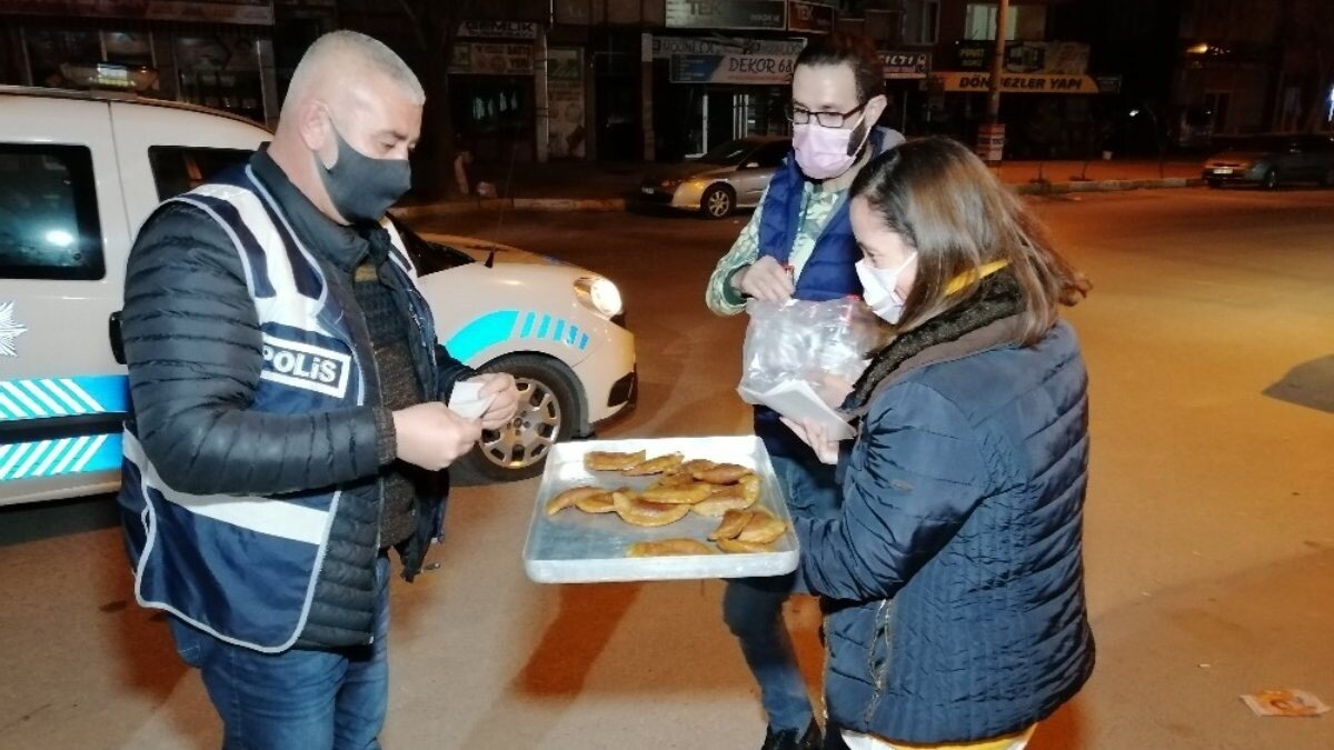 Aksaray'da lokanta işletmeciliği yapan Mehmet Keleşoğlu ve eşi Fatma Keleşoğlu, koronavirüs salgınıyla mücadele kapsamında uygulanan sokağa çıkma kısıtlamasında gece görev yapan polis, jandarma, sağlık çalışanları ve itfaiye ekiplerine ziyaret ederek hem moral verdi.