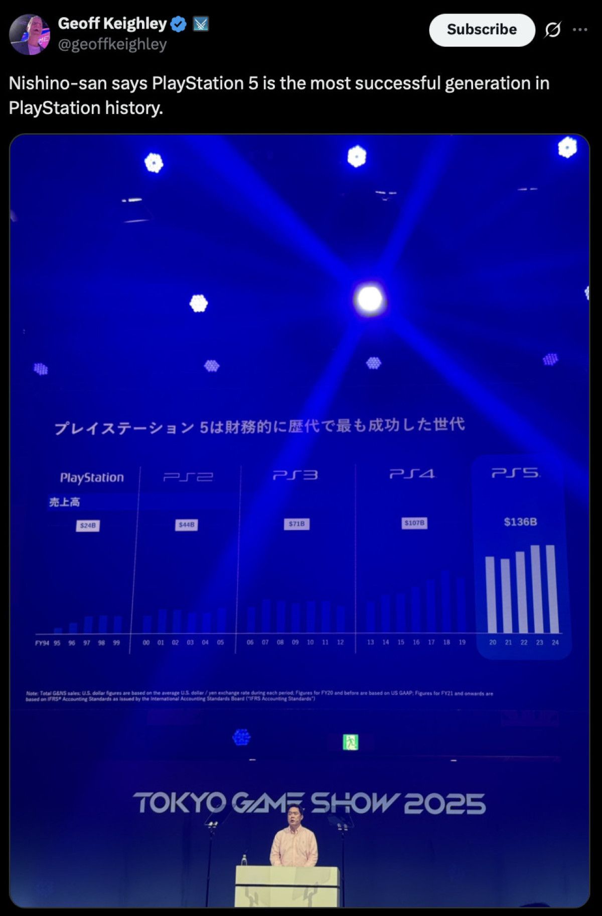 - Sony, Tokyo Game Show 2025'teki açıklamasında PlayStation 5'in şirket tarihinin en başarılı konsolu olduğunu duyurdu.