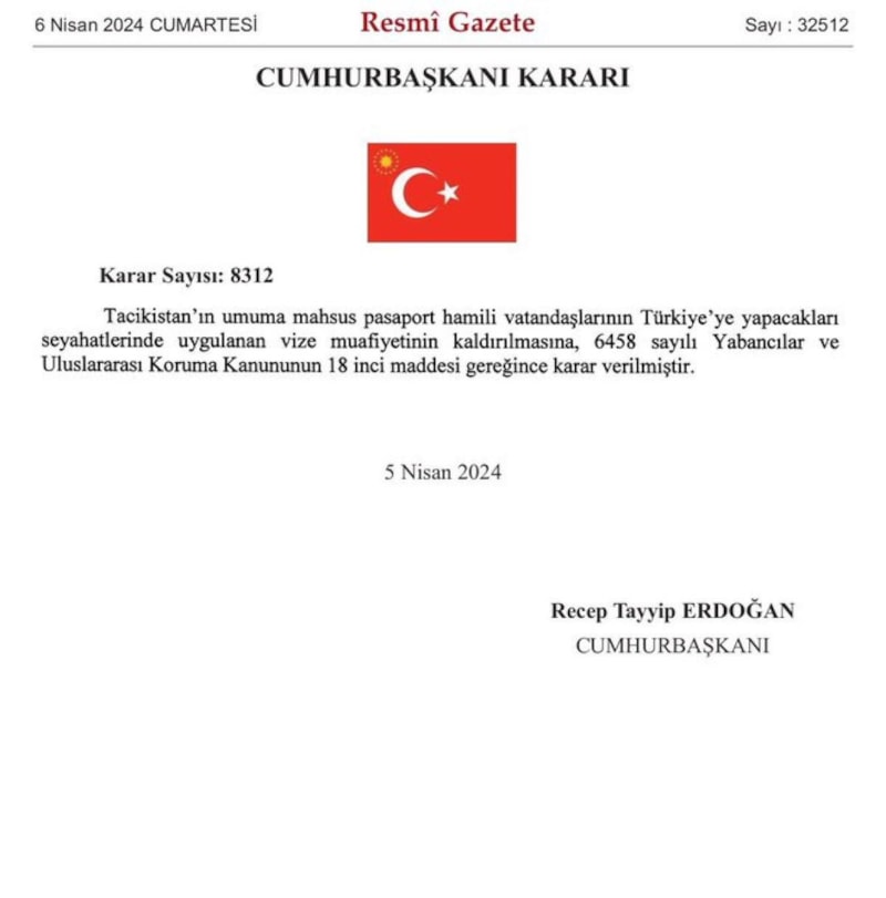 Cumhurbaşkanı Recep Tayyip Erdoğan’ın imzasıyla yayınlanan karara göre Tacikistan’ın umuma mahsus pasaport hamili vatandaşlarının Türkiye’ye yapacakları seyahatlerinde uygulanan vize muafiyeti kaldırıldı.