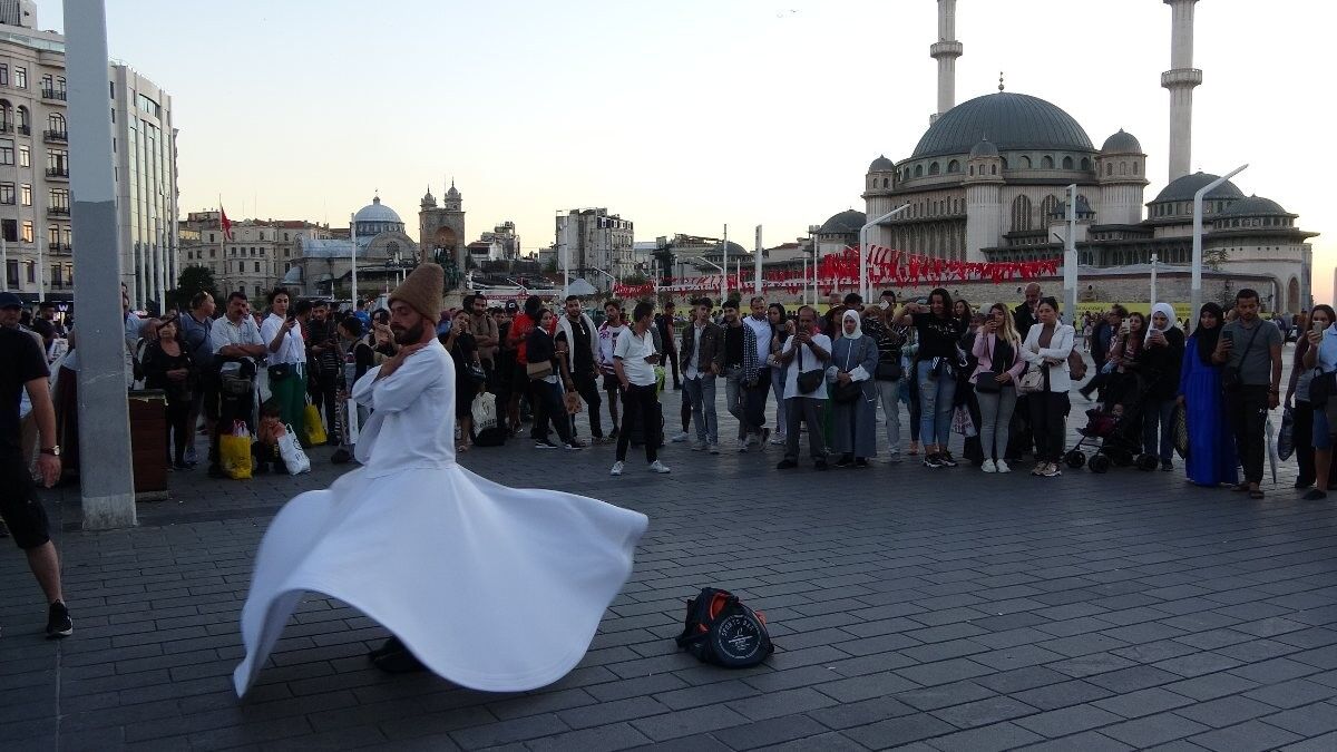 Taksim Meydanı’nda yapılan sema gösterisi vatandaşlar tarafından ilgiyle izlendi. Çevredeki yerli ve yabancı turistler o anları cep telefonlarına kayıt etti.