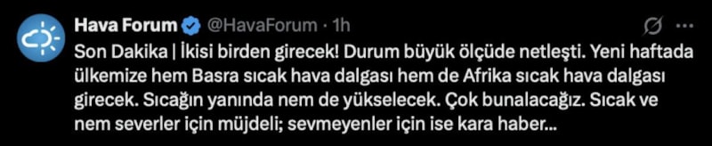 Paylaşımında, "Son Dakika | İkisi birden girecek! Durum büyük ölçüde netleşti. Yeni haftada ülkemize hem Basra sıcak hava dalgası hem de Afrika sıcak hava dalgası girecek. Sıcağın yanında nem de yükselecek. Çok bunalacağız. Sıcak ve nem severler için müjdeli; sevmeyenler için ise kara haber..." ifadelerine yer verdi.