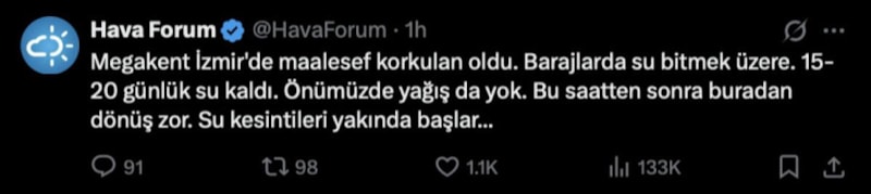 Hava Forum, İzmir'de kuraklık sebebiyle barajlarda 15-20 günlük su kaldığını duyurdu.