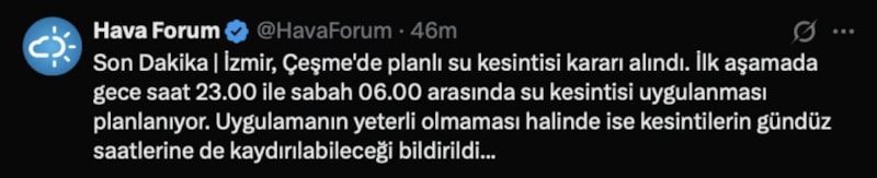 Bu nedenle İzmir Çeşme'de planlı su kesintisi kararı alındığını açıkladı. Hava Forum'un açıklamasına göre, ilk aşamada gece saat 23.00 ile sabah 06.00 arasında su kesintisi uygulaması planlanıyor.