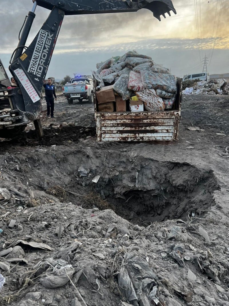 Ekipler tarafından kamyonlara yüklenen ürünler, açılan topraklar çukurlarda ateşe verilerek imha edildi.