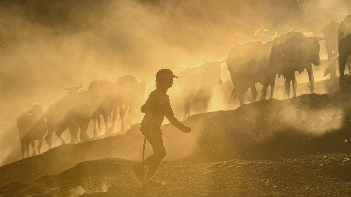 Vadide ilerleyen sürüler, yaklaşık 5 kilometrelik yolculuk sırasında yoğun bir toz bulutu oluşturuyor.