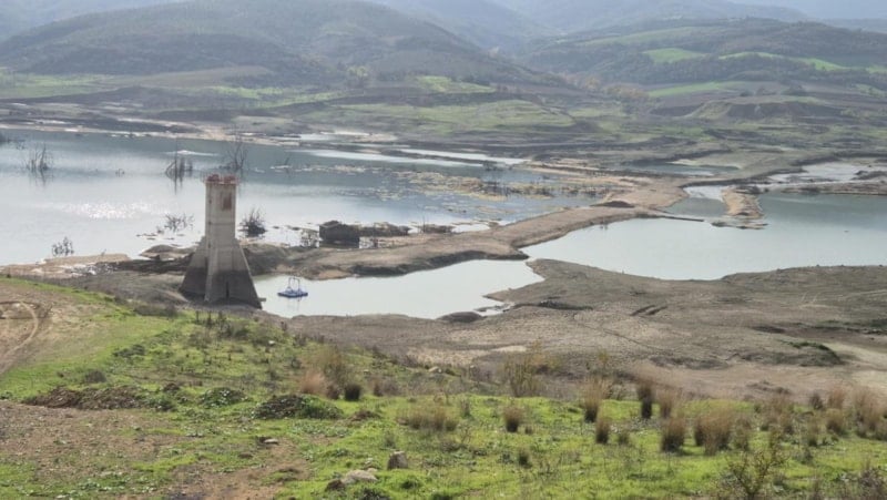 Barajda kalan su miktarı neredeyse yok denecek kadar azalınca yıllardır su altında bulunan yapılar ve ağaçlar gün yüzüne çıktı.