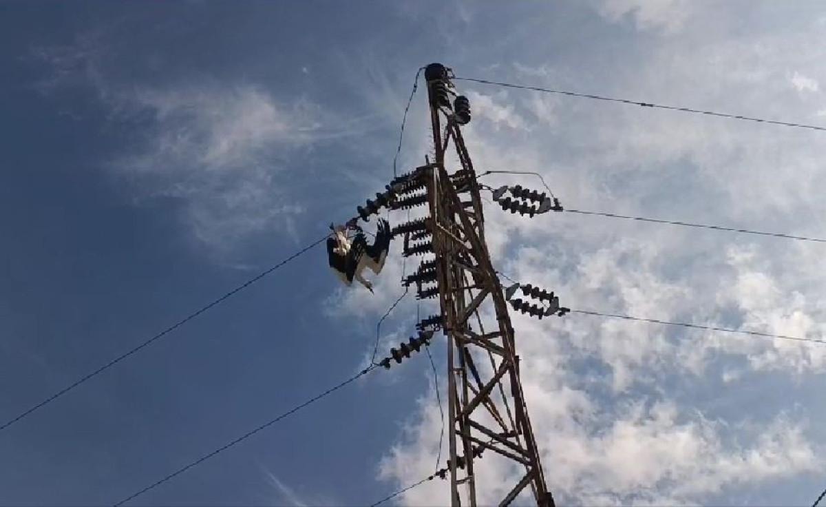 Tekirdağ'da Çorlu - Süleymanpaşa yolu üzeri Yenice Mahallesi mevkiinde yoldan geçen vatandaşlar, yüksek gerilim hattında bir leyleğin asılı kaldığını fark etti.