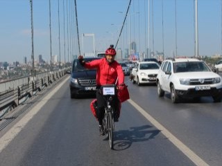 Çakmak, ay yıldızlı eşofmanı, bisikletine astığı Türk bayrağı ve "Münih-Ankara" yazısıyla vatandaşların dikkatini çekerken, araçlarıyla yoldan geçen birçok İstanbullu da klakson çalarak, kendisine destek verdi.