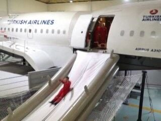 Kursiyerler uçakta olası bir tahliye anında tahliye slide’larından atlayarak eğitim görüyor. Uçuşlarda yaşana bilecek tüm riskler uygulamalı anlatılıyor.