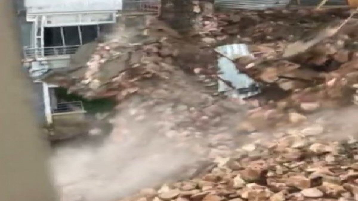 Aşırı yağışlar dolayısıyla il merkezinde bulunan bir apartmanın istinat duvarının çökme anı, saniye saniye kameralara yansıdı.