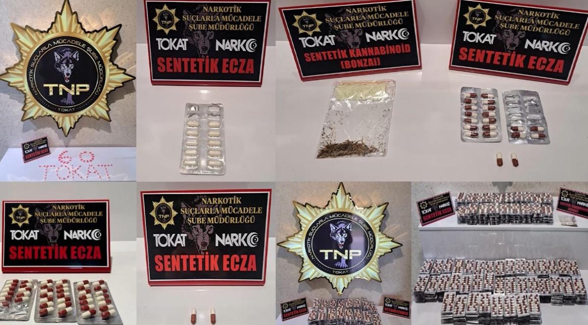 Operasyonda, 10 bin 301 adet sentetik ecza hap, 158.5 gram sentetik kannabinoid (bonzai), 5.41 gram metamfetamin ve 110 içimlik peçeteye emdirilmiş bonzai ele geçirildi.
