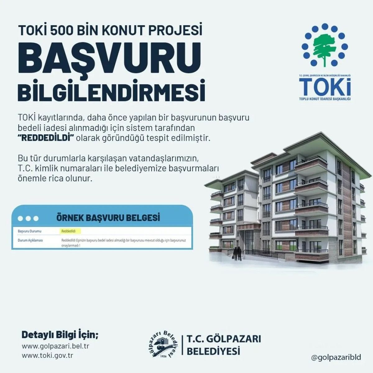 Gölpazarı Belediyesi, TOKİ’nin 500 Bin Konut Projesi kapsamında başvuruda bulunan vatandaşları yakından ilgilendiren önemli bir duyuru yayımladı.