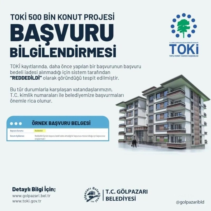“TOKİ 500 Bin Konut Projesi’ne daha önce başvuruda bulunan bazı vatandaşlarımızın sistemde başvurularının ‘Reddedildi’ olarak göründüğü tespit edilmiştir. Bunun nedeni, geçmiş başvuru bedeli iadesinin vatandaş tarafından alınmamış olmasıdır. Bu nedenle sistem otomatik olarak başvuruyu reddedilmiş gibi göstermektedir.”