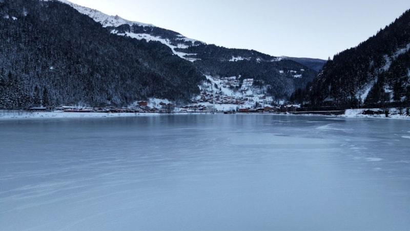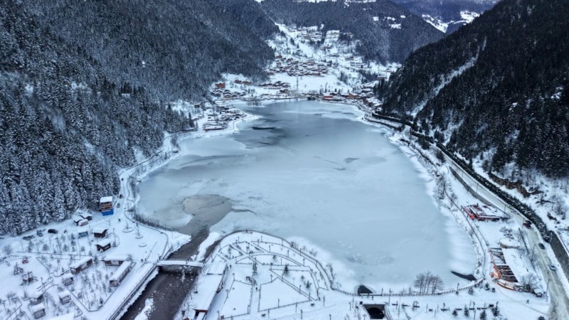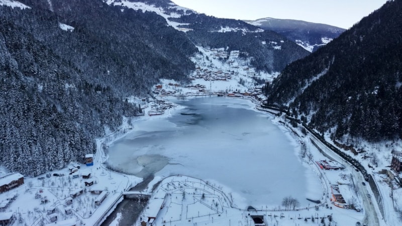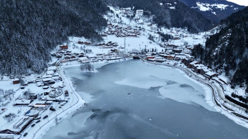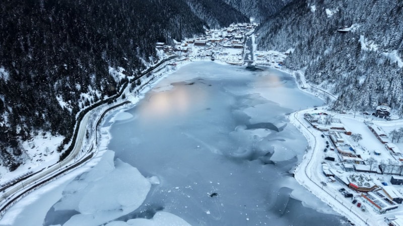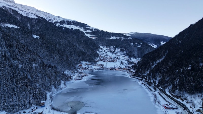 Çaykara ilçesinde bulunan dünyaca ünlü turizm merkezi Uzungöl’ün yüzeyinin büyük kısmı, bölgede etkili olan kar yağışının ardından buzla kaplandı.