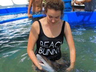 Tatilciler, köpek balıklarını havuzda yakından görüp dokunmak için 3 lira, onlarla yüzmek için 50 lira ödüyor. Balıklarla yüzmek isteyen 18 yaşından küçüklerden 30 lira alınıyor.