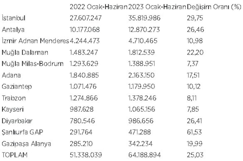 Türkiye'nin turizm cenneti destinasyonlarına ilgi, havalimanı yolcu sayılarına yansıdı. Bu yılın ocak-haziran döneminde İstanbul Havalimanı 35,8 milyon, Antalya Havalimanı 12,9 milyon, İzmir Adnan Menderes Havalimanı 4,7 milyon yolcuya hizmet verdi.