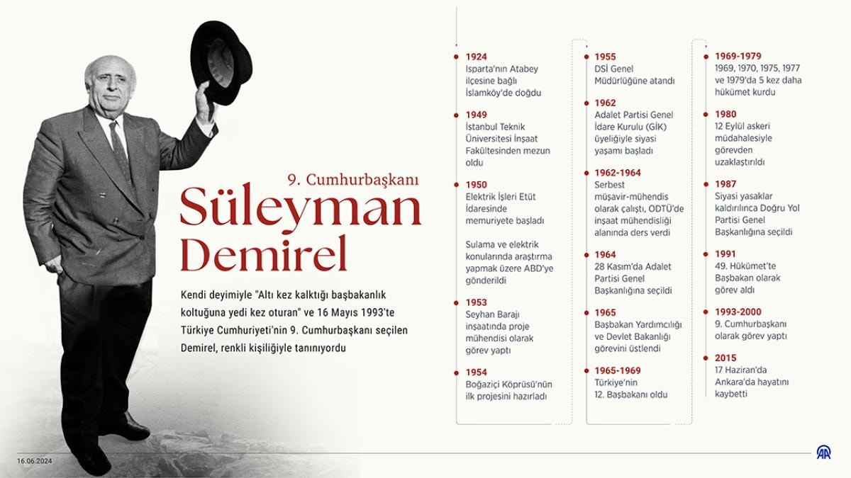 Bugün, Türk siyasetinin renkli simalarından biri olan 9. Cumhurbaşkanı Süleyman Demirel'in ölümünün dokuzuncu yıl dönümü.