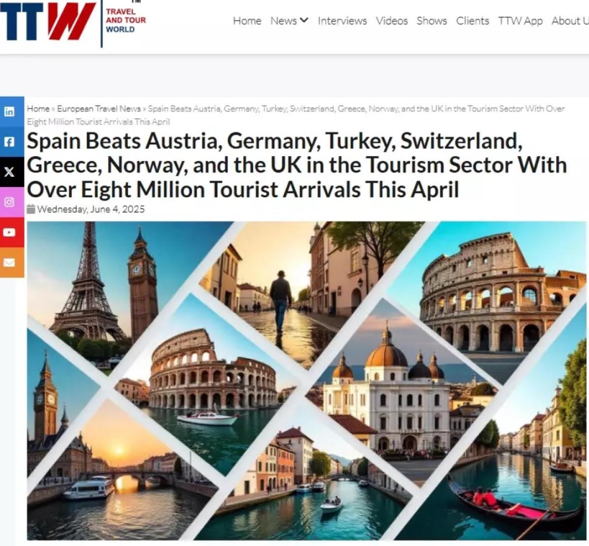 Travel And Tour World’ün (TTW) haberine göre, İspanya Nisan 2025’te 8 milyonun üzerinde uluslararası turisti ağırlayarak Almanya, Avusturya, Türkiye, Yunanistan, İsviçre ve Birleşik Krallık gibi rakiplerini geride bıraktı.