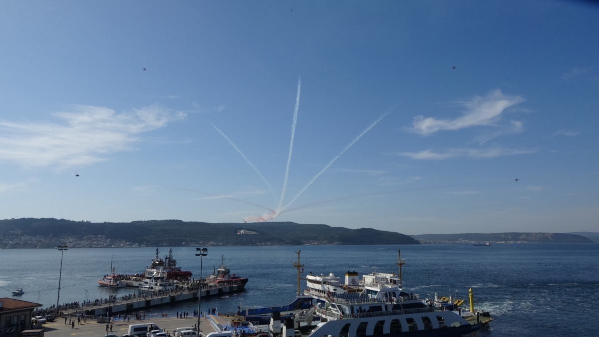 Uçuş sırasında, Türk Yıldızları'nın Boğaz üzerinde çizdiği kalp şekli, Çanakkale'ye ve tüm şehitlerimize olan saygıyı simgeliyor, izleyenlerden büyük alkış topladı.