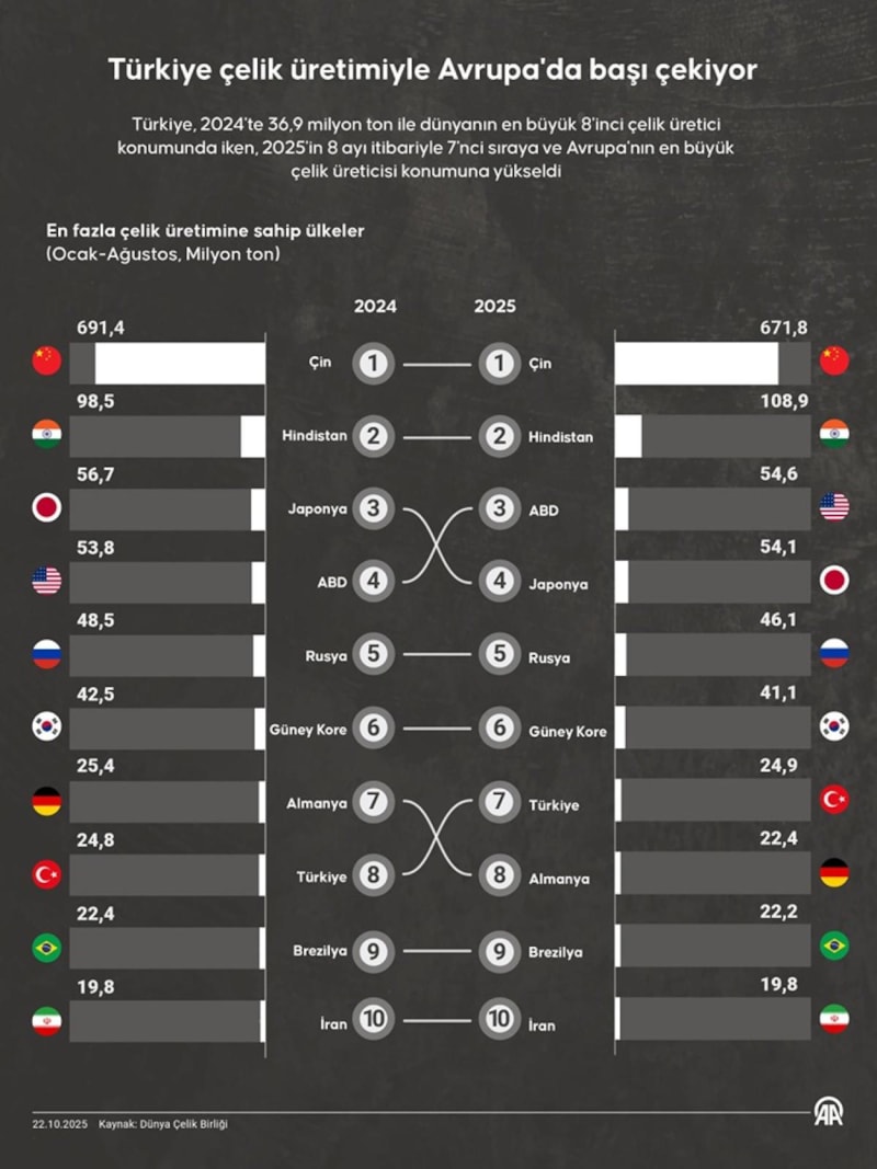 Türkiye, 2025’in ilk 8 ayında çelik üretiminde Avrupa’nın lideri, dünyanın ise yedinci büyük üreticisi konumuna yükseldi.