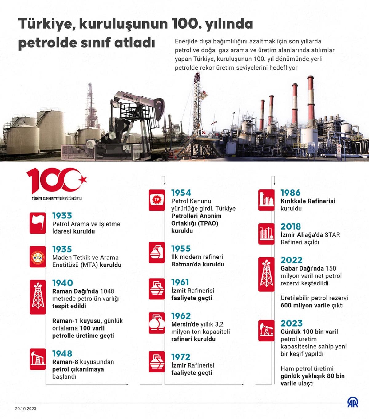 Anadolu Ajansının (AA) Cumhuriyet'in 100. yıl dönümü nedeniyle hazırladığı dosya haberler kapsamındaki bu haberde, Türkiye'nin petrol arama ve üretimi alanlarında tarihi boyunca gerçekleştirdiği atılımlar anlatıldı.