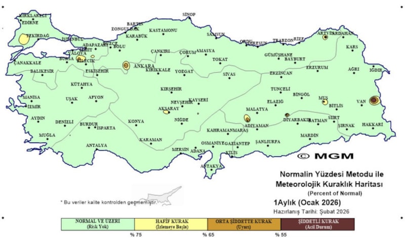 Bu kapsamda Meteoroloji Genel Müdürlüğü (MGM), Normalin Yüzdesi Metodu ile hazırladığı 2026 Ocak ayı meteorolojik kuraklık haritasını yayımladı.