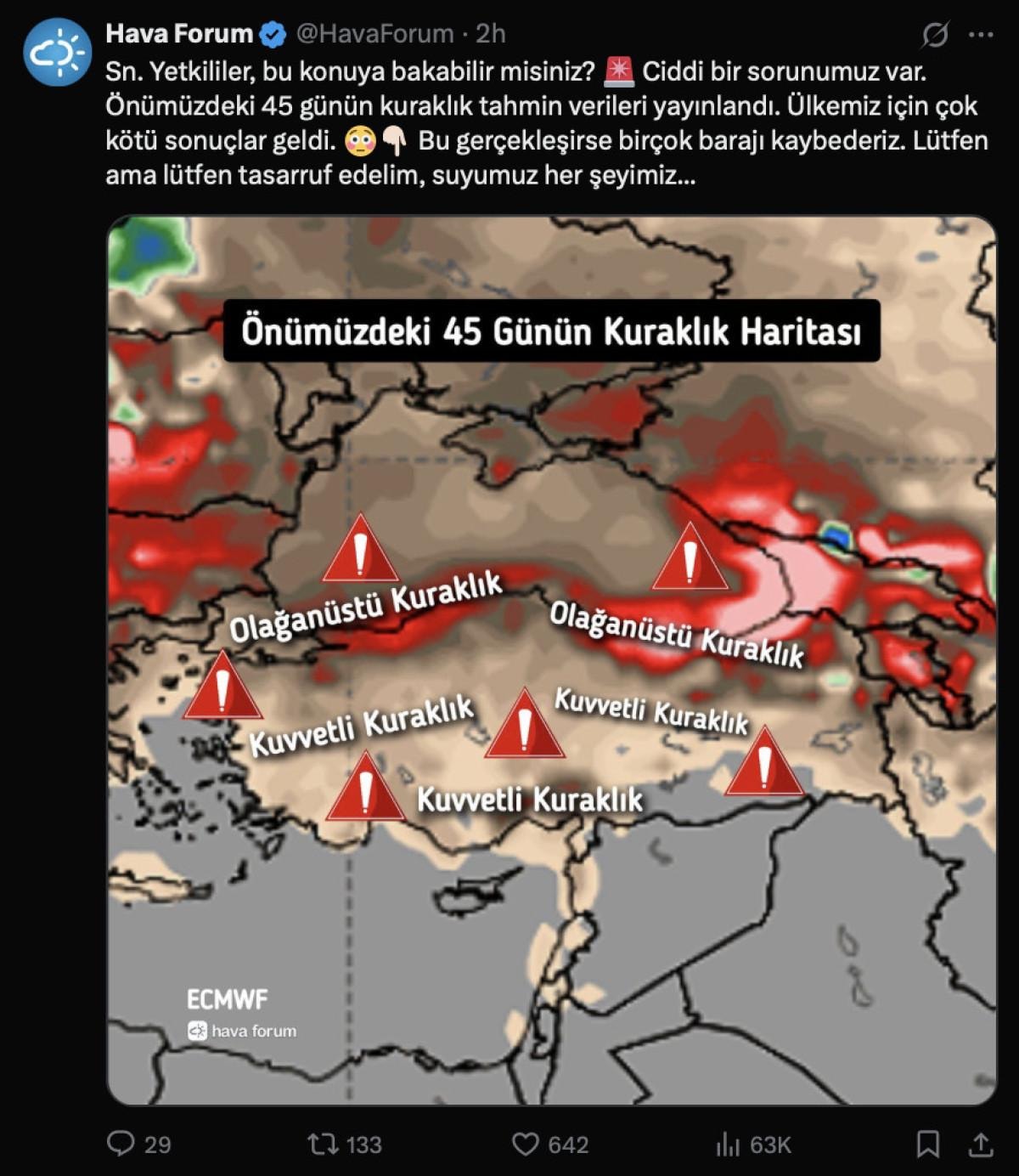 “Sn. Yetkililer, bu konuya bakabilir misiniz? Ciddi bir sorunumuz var. Önümüzdeki 45 günün kuraklık tahmin verileri yayınlandı. Ülkemiz için çok kötü sonuçlar geldi. Bu gerçekleşirse birçok barajı kaybederiz. Lütfen ama lütfen tasarruf edelim, suyumuz her şeyimiz…”