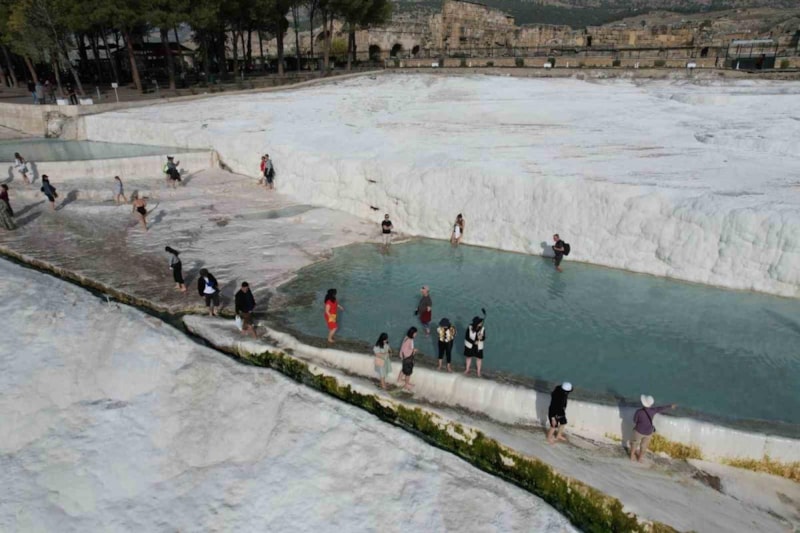 UNESCO Dünya Kültür Mirası Listesi’nde yer alan Pamukkale travertenlerine yerli ve yabancı turistlerin ilgisi sürüyor.