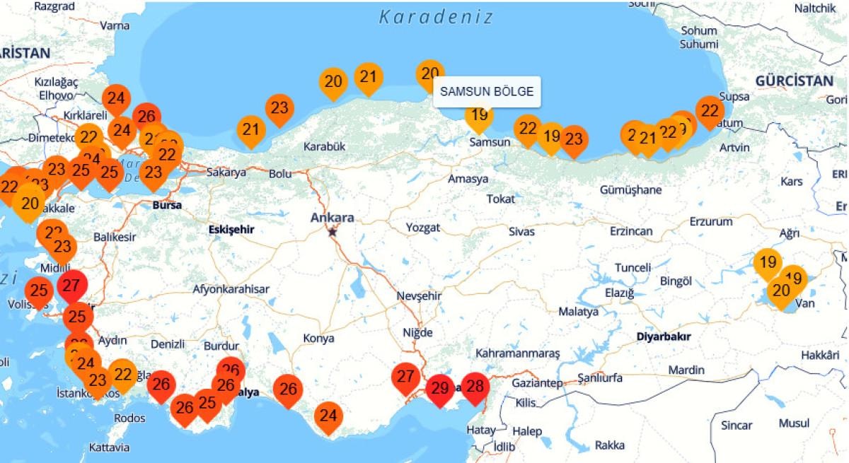 Samsun’da ise deniz suyu sıcaklığı 19 derece ile Karadeniz’in en soğuk deniz suyu sıcaklığı olarak dikkat çekiyor.