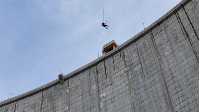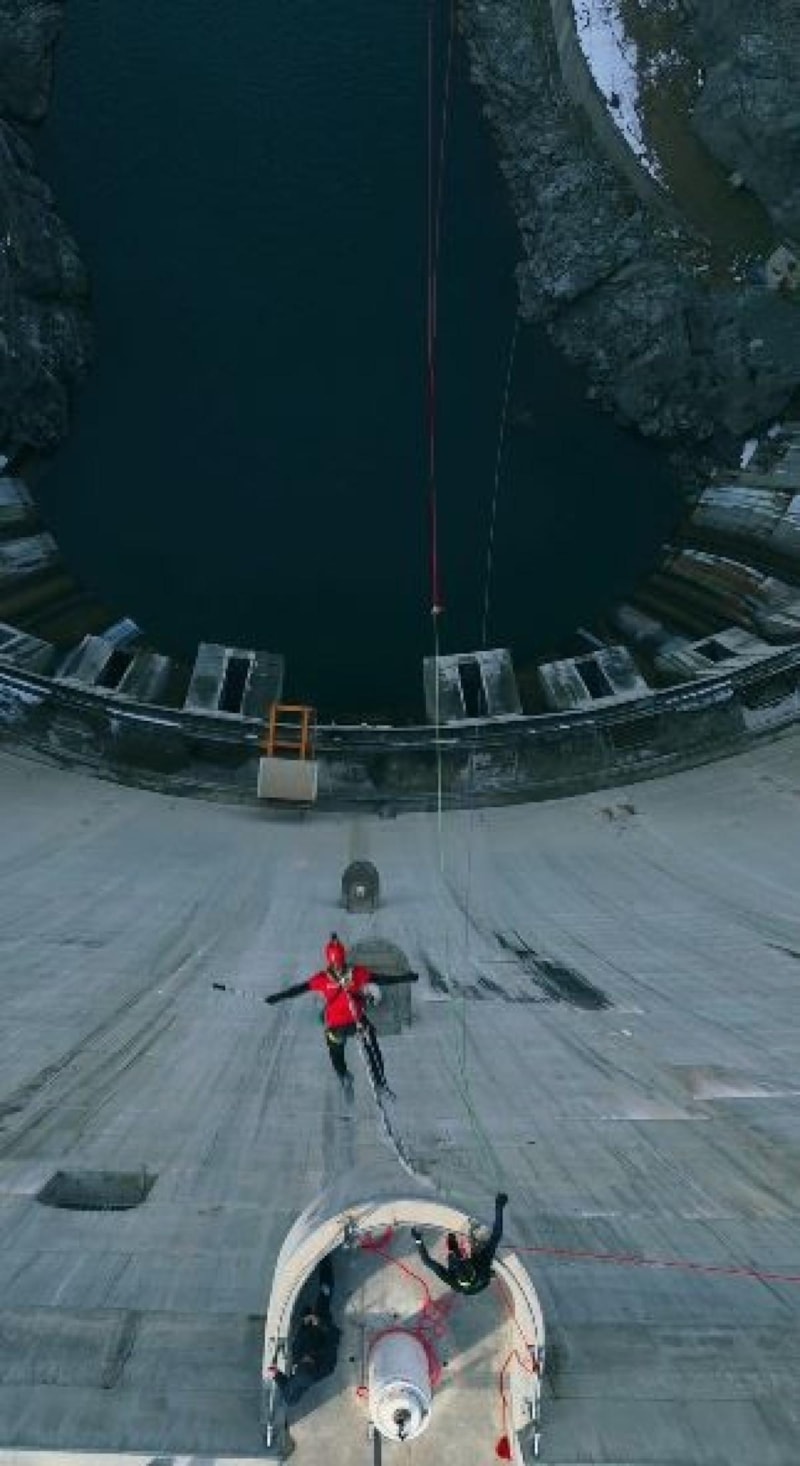 Baraj gövdesine karşıdan karşıya halatlar çekildi ve tüm güvenlik önlemleri alındıktan sonra ekip üyeleri, 249 metreden kendilerini boşluğa bıraktı.