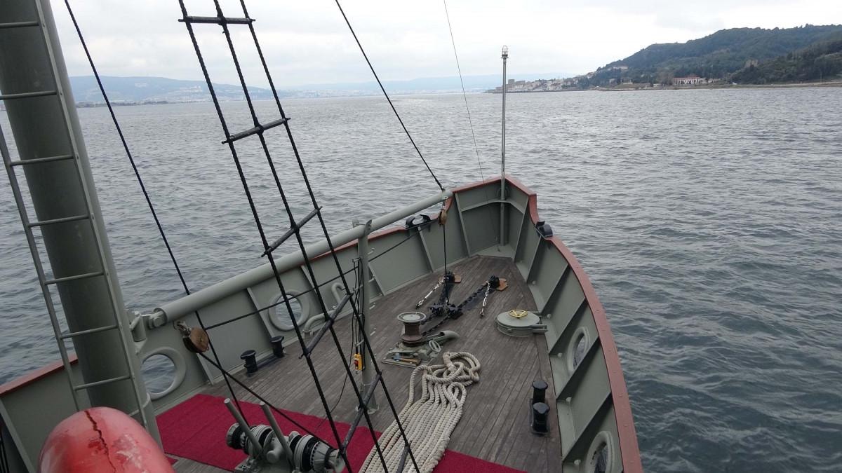 Çanakkale Deniz Müzesi Komutanlığı Yüzer İskelesi'nde demirli bulunan "TCG Nusret (N-16)" adlı gemi, mayınlarını döktüğü rotada ilerledi.