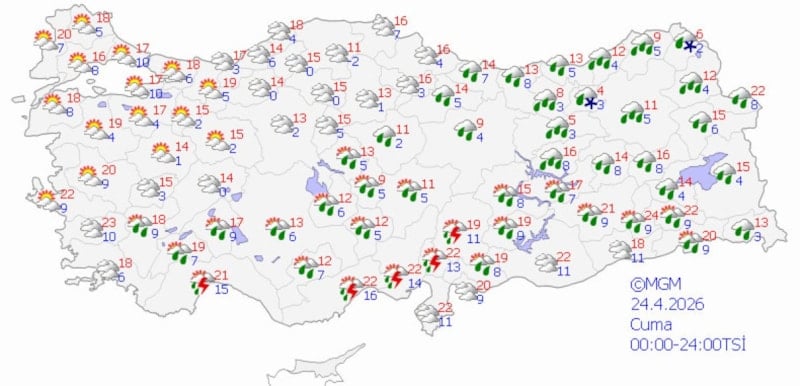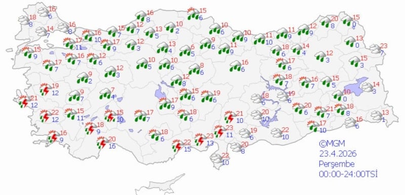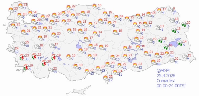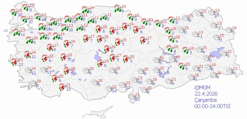 MGM'nin son verilerine göre sıcaklıkların, ülke genelinde mevsim normallerinin 1-3 derece altında seyretmesi bekleniyor. Hafta boyunca aralıklı sağanak ve gök gürültülü sağanak yağışlar etkili olacak.