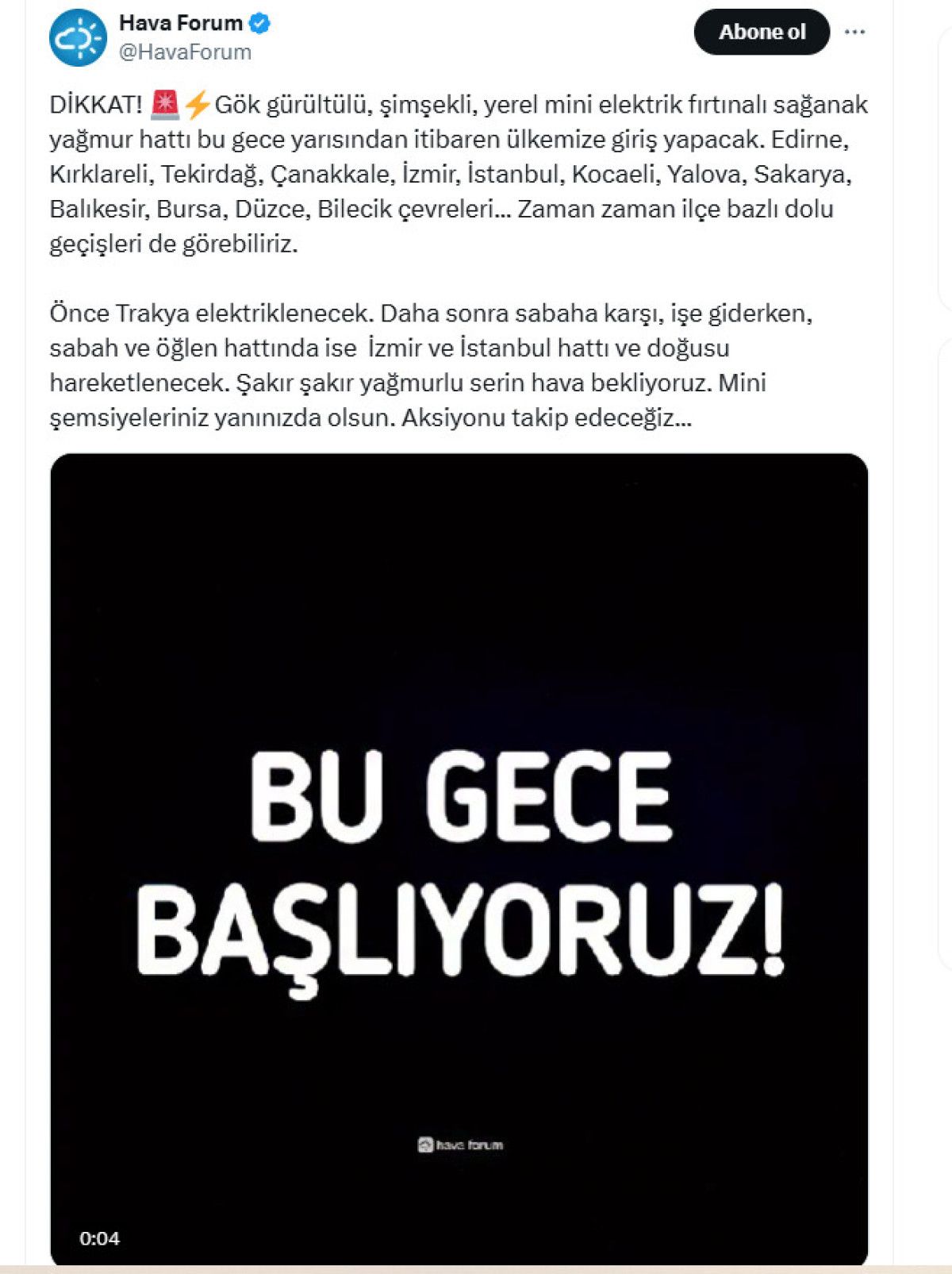 Önce Trakya elektriklenecek. Daha sonra sabaha karşı, işe giderken, sabah ve öğlen hattında ise İzmir ve İstanbul hattı ve doğusu hareketlenecek. Şakır şakır yağmurlu serin hava bekliyoruz. Mini şemsiyeleriniz yanınızda olsun. Aksiyonu takip edeceğiz..." denildi.